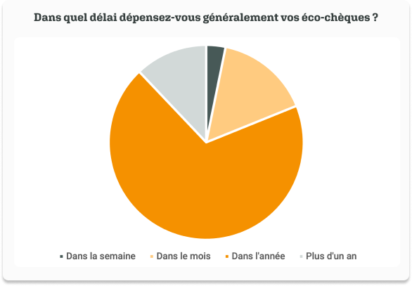 Nos bénéficiaires ne laissent pas dormir leurs éco-chèques. Ils sont près de 88% à les dépenser dans la première année, dont 19% à les dépenser dans le mois!