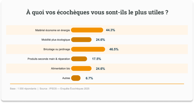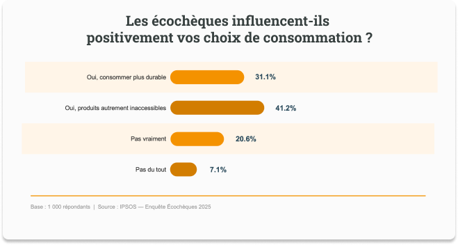 L’écochèque joue en effet un rôle incitatif. Plus de sept bénéficiaires sur dix (72 %) reconnaissent qu’il influence positivement leurs décisions d’achat en faveur de produits durables qu’ils n’auraient pas acquis sans cet avantage. En cas de suppression, 77% des bénéficiaires se déclareraient très insatisfaits et considéreraient cette mesure comme une perte de salaire net, tandis que près de la moitié estiment que le dispositif devrait être renforcé.