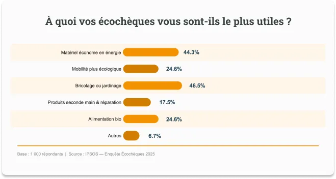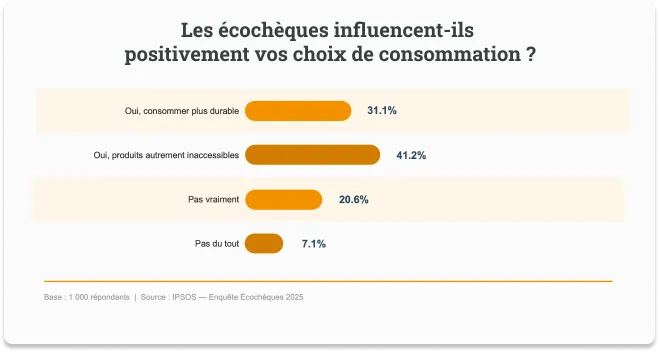 L’écochèque joue en effet un rôle incitatif. Plus de sept bénéficiaires sur dix (72 %) reconnaissent qu’il influence positivement leurs décisions d’achat en faveur de produits durables qu’ils n’auraient pas acquis sans cet avantage. En cas de suppression, 77 % des bénéficiaires se déclareraient très insatisfaits et considéreraient cette mesure comme une perte de salaire net, tandis que près de la moitié estiment que le dispositif devrait être renforcé.