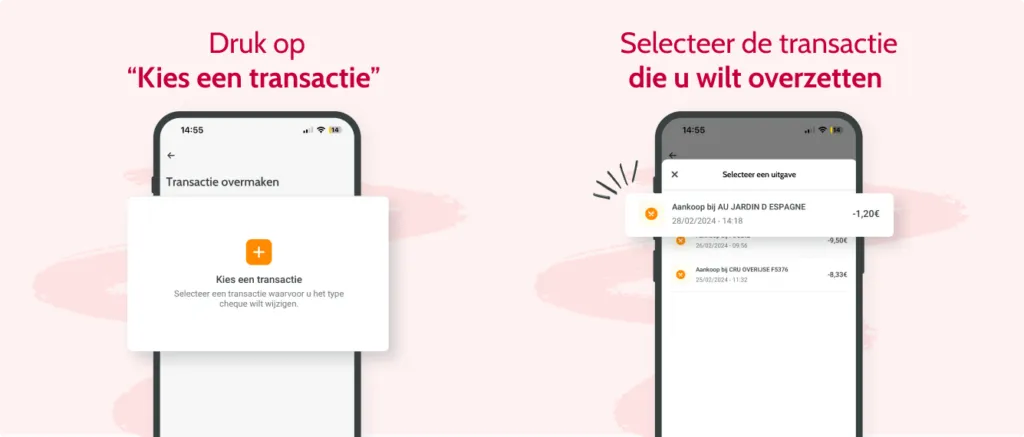 Wou u uw koopkrachtpremie of cadeaucheques gebruiken om te betalen? Maar werden uw maaltijd- of ecocheques gedebiteerd? Geen paniek, u hebt 30 dagen om de transactie over te zetten. Een transactie overzetten dat doet u gemakkelijk in slechts 10 seconden in de app.