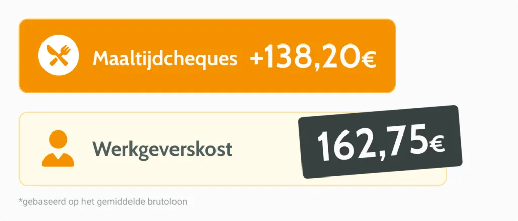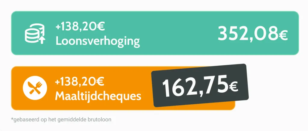 👉 Als je een loonsverhoging van €138,20 extra netto per maand wil geven, kost je dit €352,08. Maaltijdcheques aanbieden ter waarde van €138,20 per maand kost je slechts €162,75. Dit is 2x voordeliger!